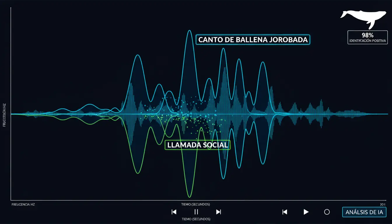 La Solución con IA: La IA nos permite "escuchar el planeta". En proyectos de conservación, se despliegan redes de sensores acústicos en bosques y océanos. Estos dispositivos graban continuamente el sonido del ambiente. Luego, algoritmos de IA procesan terabytes de datos de audio para identificar las "voces" del ecosistema: el canto de aves en peligro de extinción, el movimiento de mamíferos clave o, tristemente, el ruido de una motosierra o un barco de pesca ilegal.
