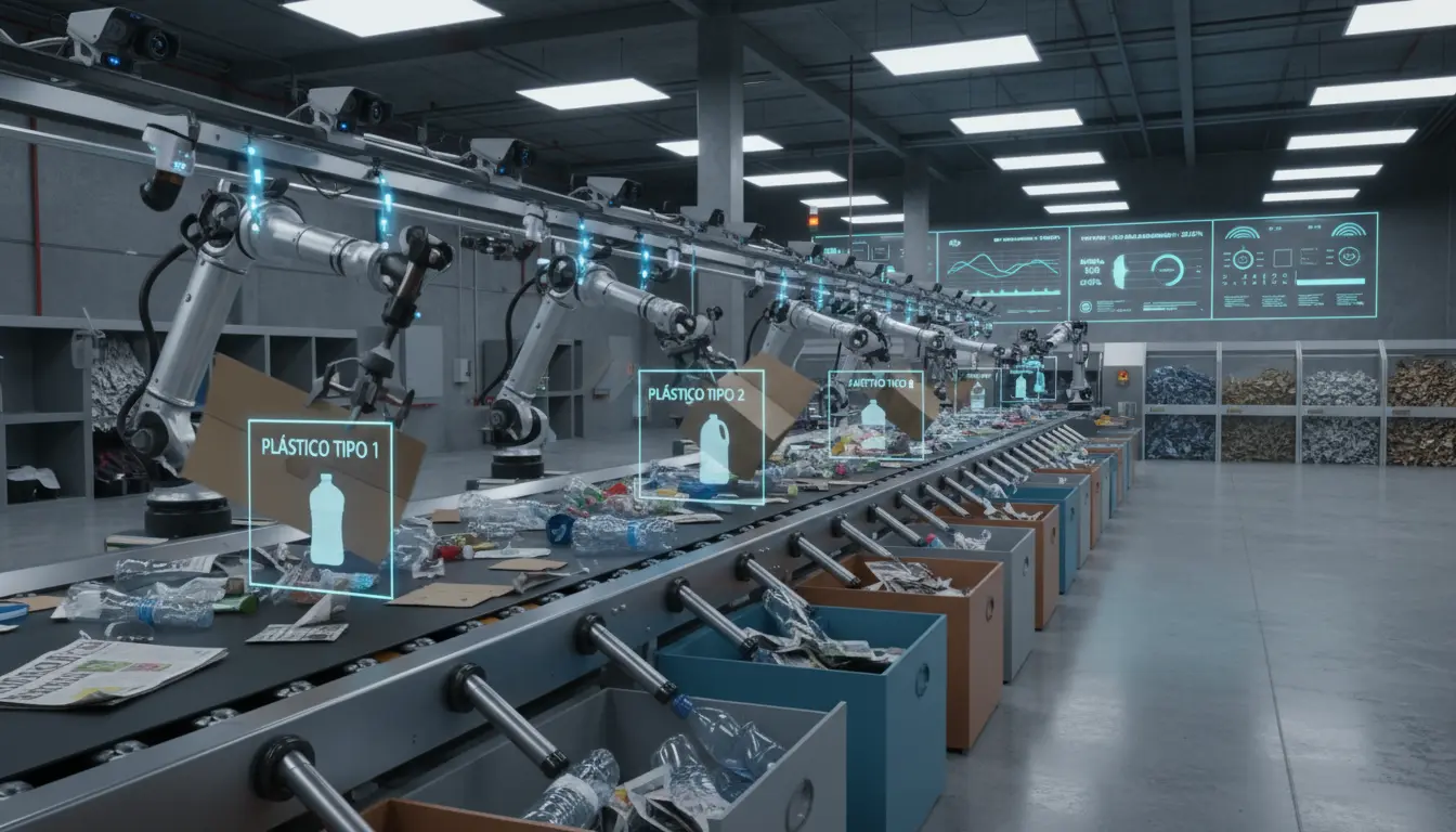 La Solución con IA: Los sistemas de clasificación de residuos impulsados por IA utilizan visión por computadora para identificar y separar materiales a una velocidad y precisión sobrehumanas. Una cinta transportadora pasa bajo una cámara de alta velocidad que captura imágenes de cada objeto. Un algoritmo de IA entrenado con millones de imágenes identifica instantáneamente si es un plástico PET, un cartón, un aluminio o un vidrio, y activa chorros de aire para separarlo en el contenedor correcto.